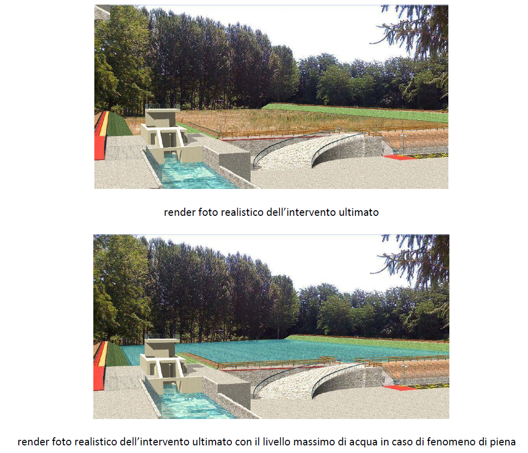 La soluzione progettuale individuata consiste nella laminazione delle piene nelle aree di monte, trattenendo l’eccedenza dell’onda di piena in un’area dedicata e rilasciandola progressivamente nel tempo, con una portata compatibile con la capacità idraulica del tratto urbano e della sezione del ponte sulla SP 335.
