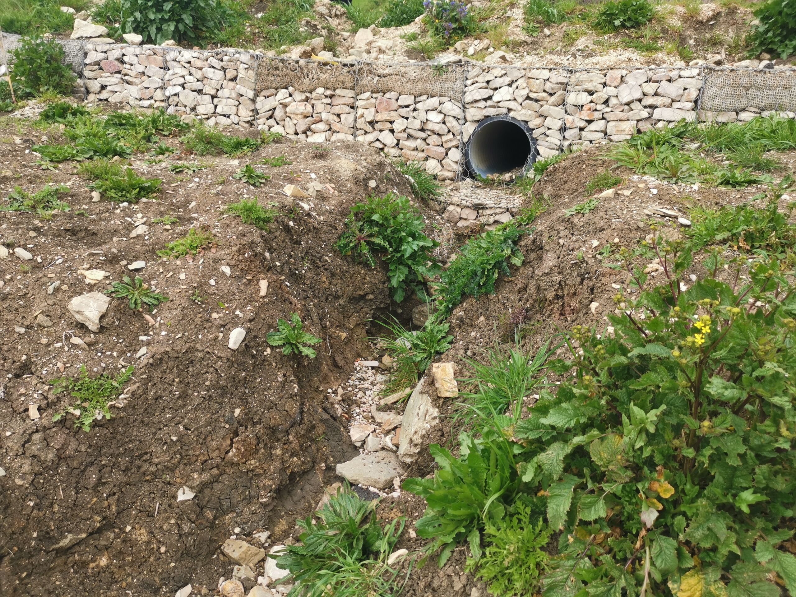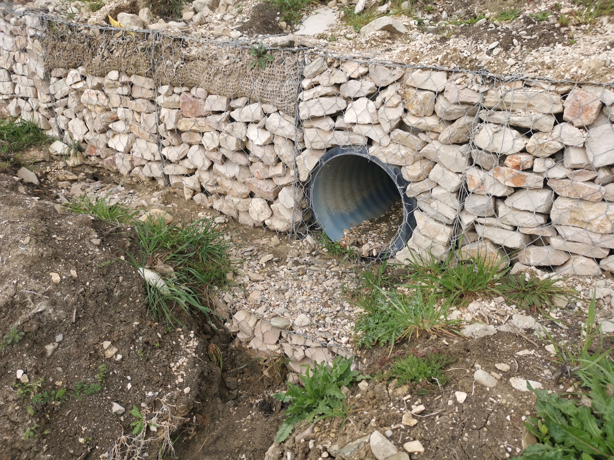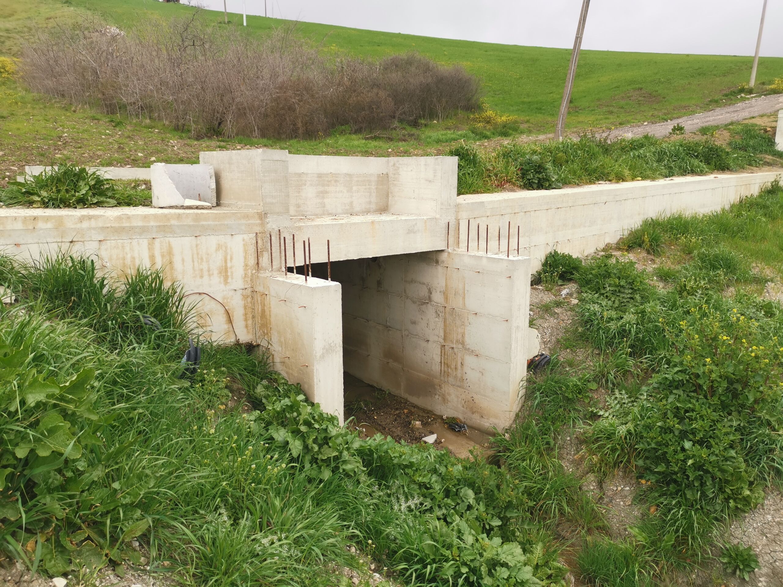 Opera d’arte idraulica: Costruzione di un tombino in calcestruzzo di grandi dimensioni (3,20 m x 3,00 m) nel punto di intersezione tra la paratia inferiore e l’impluvio per consentire il deflusso delle acque a valle.